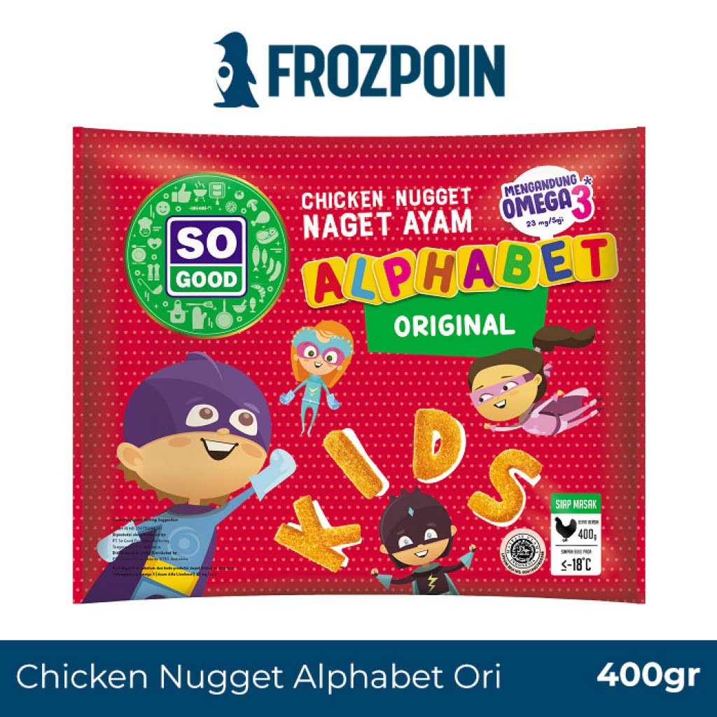 So Good Chicken Nugget ALPHABET sajian yang menggugah selera, dibuat dari daging dada ayam pilihan, dan dibalut dengan breadcrumb yang renyah. So Good Chicken Nugget ALPHABET hidangan kaya protein dengan rasa original, lezat dan disukai anak-anak. Bentuk huruf menjadi sarana edukasi anak untuk belajar merangkai kata, cocok sebagai camilan dan lauk anak tercinta. So Good Nugget Alphabet diperkaya Omega-3 yang baik untuk perkembangan otak anak.